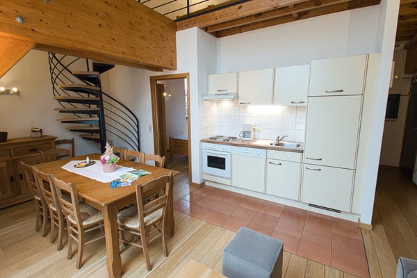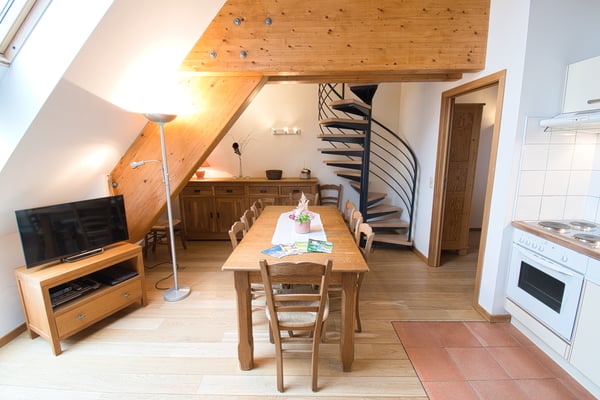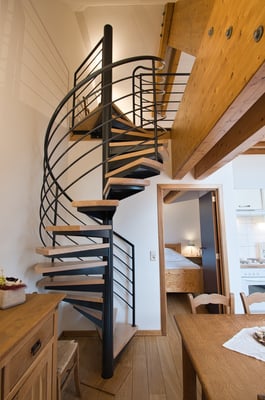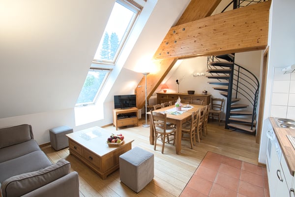 Vous disposez de deux lits simples et d'un canapé-lit sur la mezzanine accessible par un escalier en colimaçon.